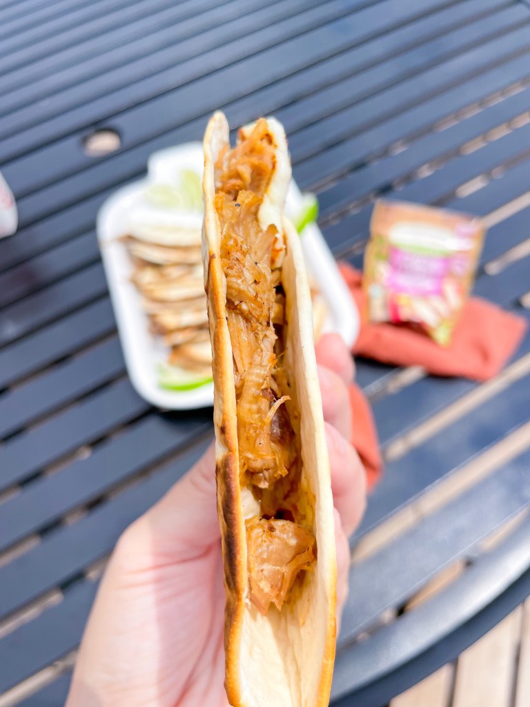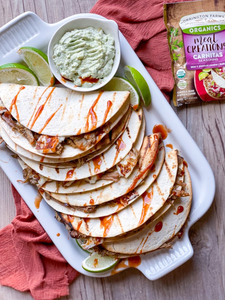 Mix the Orrington Farms seasoning packet with the water and let dissolve. (I slow cooked my pork, but the packet also includes instructions for baking or pressure cooking.) Put the meat in the slow cooker and pour the sauce over the top. Cook on med/low for 9 hours or until tender. Shred the pork and allow it to sit in the remaining sauce while you fry the panela cheese in a skillet. If you haven’t had panela cheese trust me- it’s a game changer here! Heat your grill to high, lay your tortillas on the grill and fill them with the pork carnitas and panela then fold over. Flip when grill lines appear. Drizzle with the sauce of your choice and enjoy!