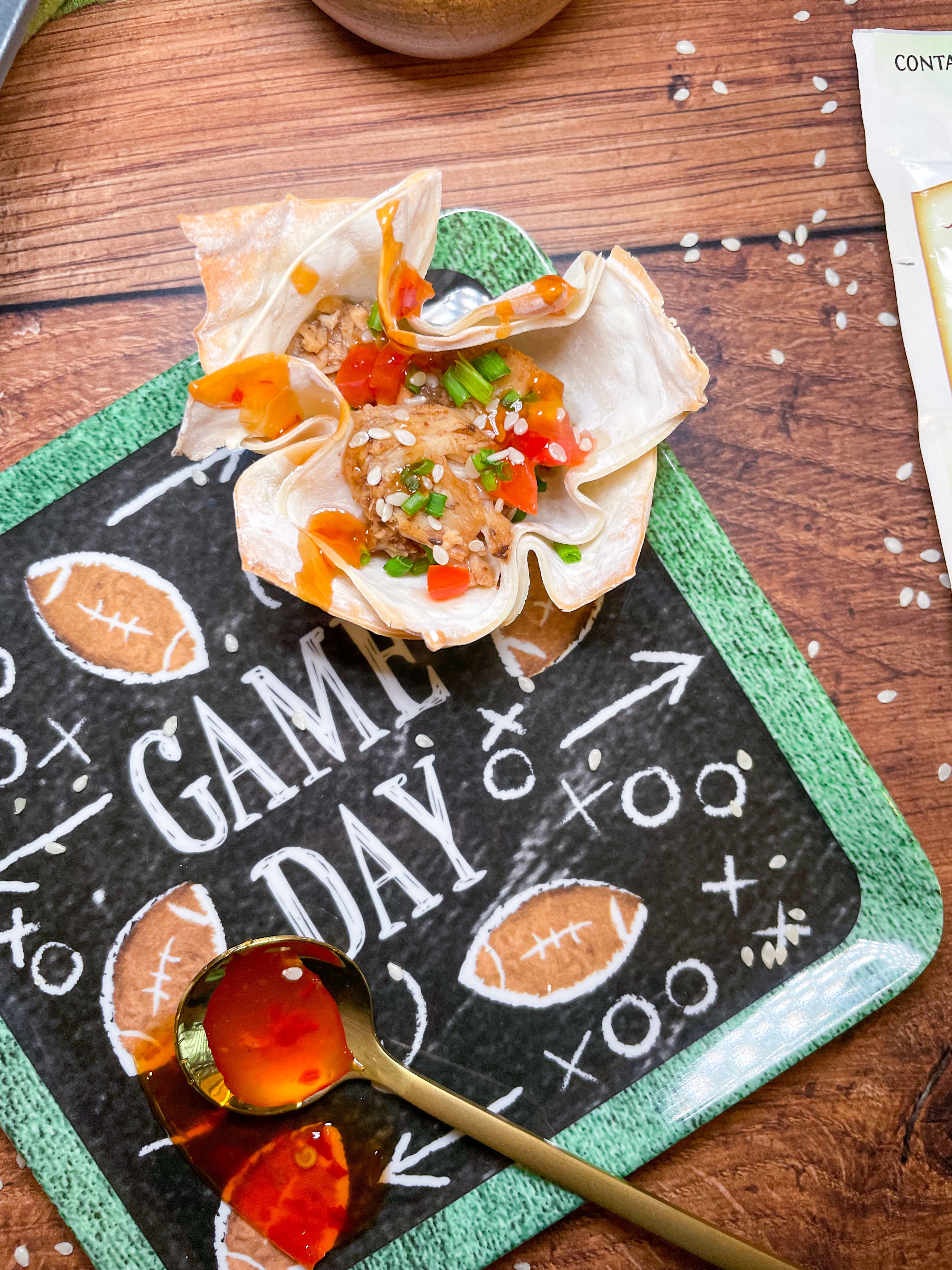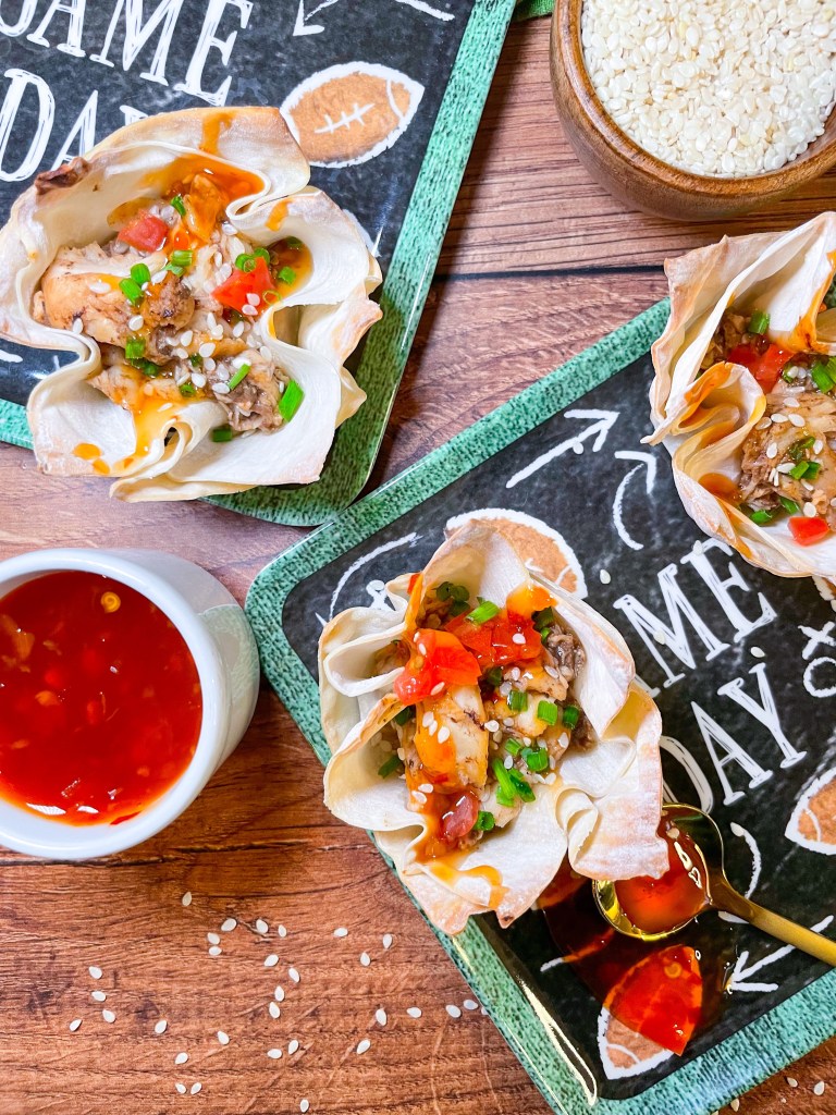 Place 2 wonton cups over lapping in each muffin tin. Add in the chicken and bake for 8 minutes at 375F or until the wonton cups get a golden crisp on the edges. Garnish with chives, chopped tomato, sesame seeds and a drizzle of red chili sauce. If you want a little heat you can also add a sriracha drizzle.