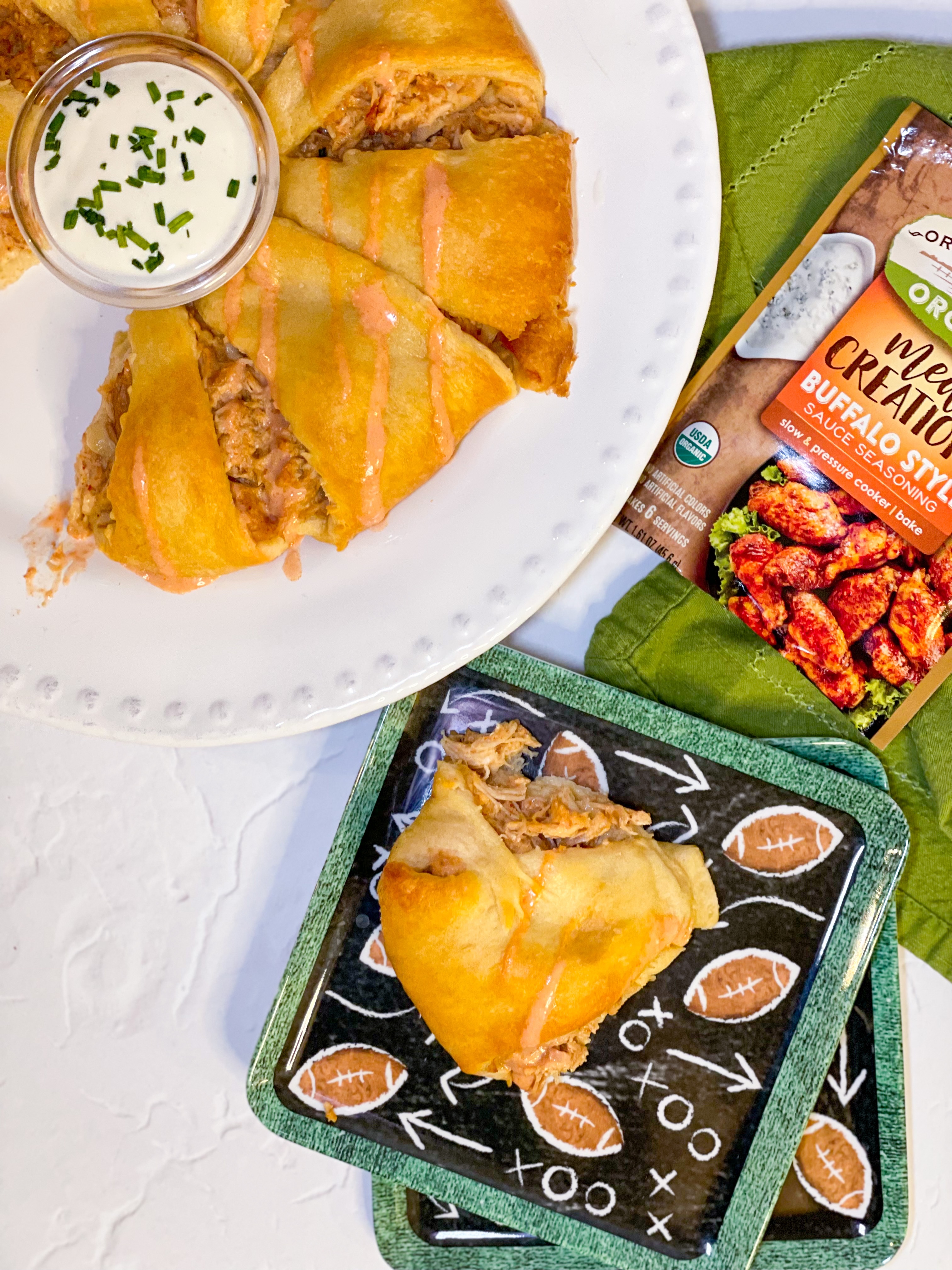 In your slow cooker mix the Orrington Farms packet with 1 cup of water. Add in your chicken and cook for 5 hours. Preheat your oven based to 375 degrees F. Shred the chicken and add in the Greek yogurt. Place crescents overlapping to form a circle with the larger side on the inside. Leave a little room in the middle for your dip! Add a large scoop of the Buffalo Chicken to each crescent and fold each one over towards the middle. Bake until golden brown about 15 minutes. Drizzle with a ranch and a little of the leftover Buffalo sauce and add your favorite dip in the middle!