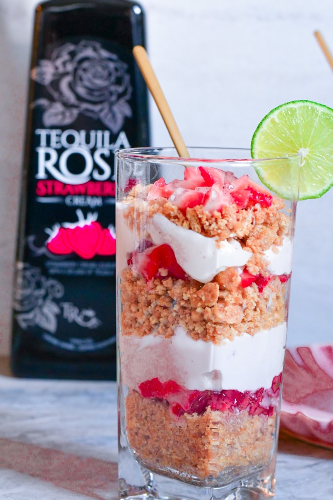Think Margarita- but in dessert form! Layers of crunchy graham cracker crust, fluffy tart cheesecake dollops and delicious creamy strawberries soaked in Tequila Rose Strawberries and Cream Liqueur.