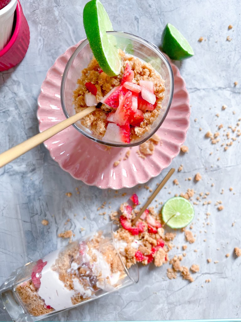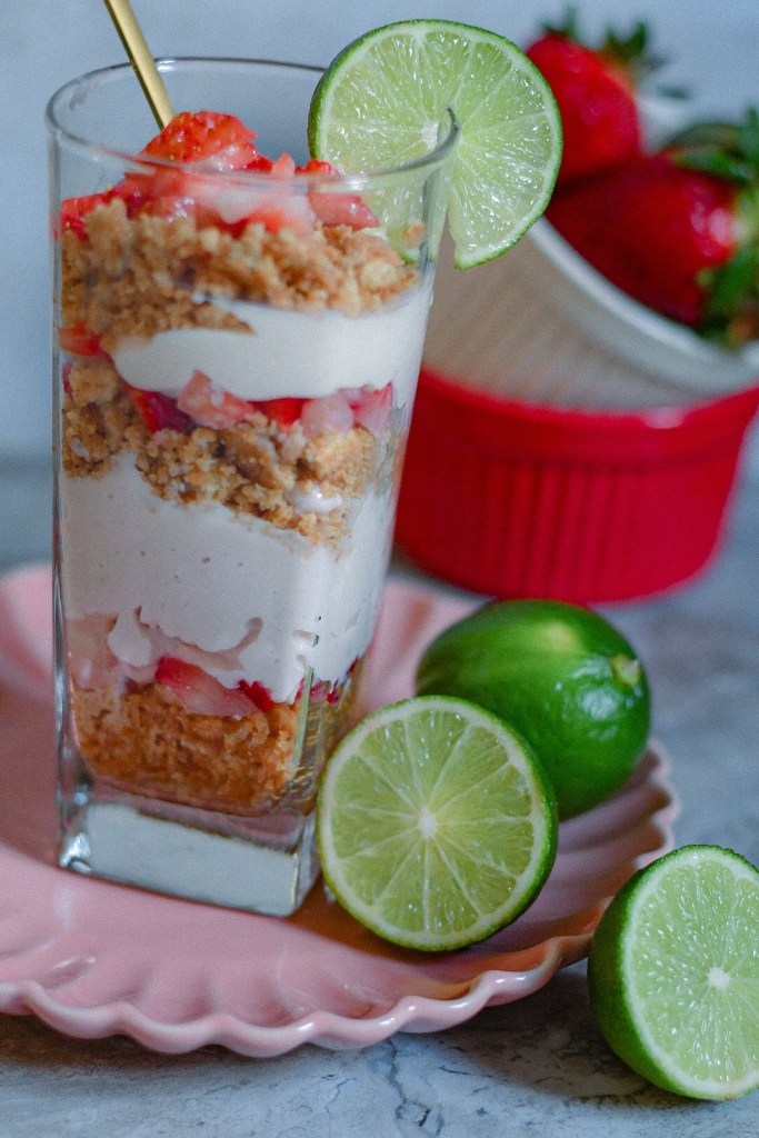 Layer a tall cocktail glass starting with the crust at the bottom. I’m a sucker for the crust on cheesecake so I made my layers of crust extra thickkk. Garnish with fresh lemon and strawberries. Best served chilled. Makes two 14 oz dessert cocktails. These would also be perfect for shooter sized glasses for a group!