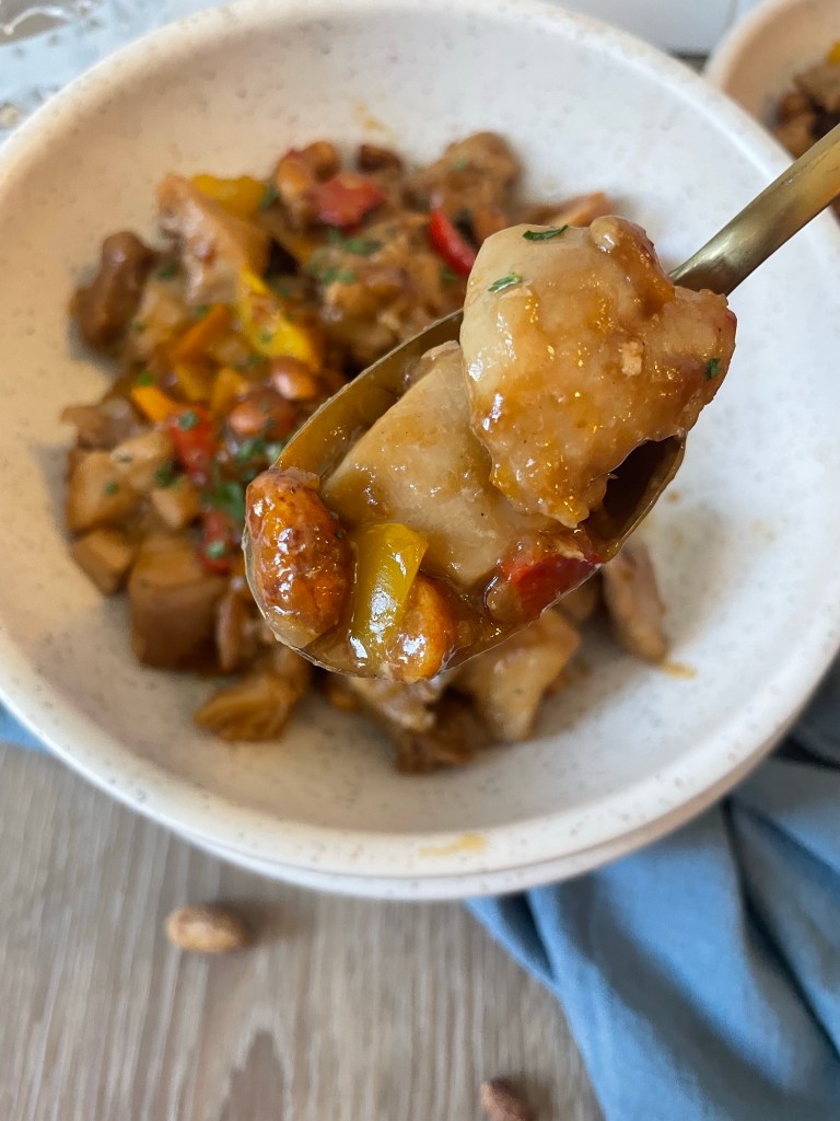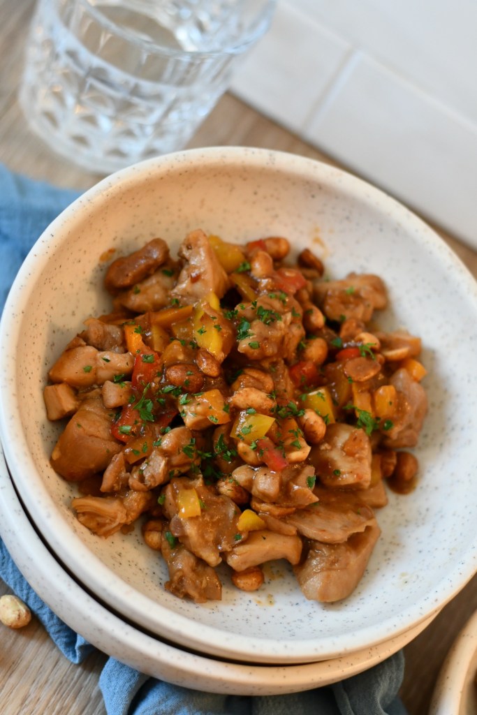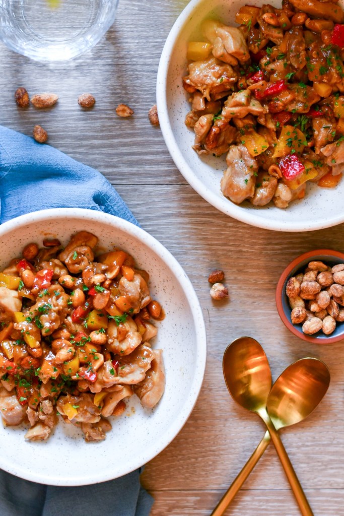 Start sprinkling the chicken with the cornstarch while the sesame oil and garlic heat in the skillet. Add the chicken. Once the chicken is cooked, add the peppers and sauce ingredients. Let the sauce simmer until it thickens. Now, add the peanuts.